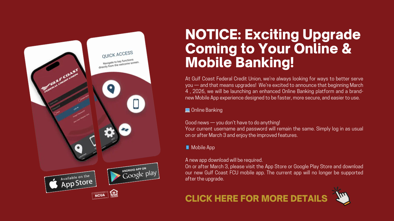 Membership restrictions may apply. Account approval, conditions, qualifications, limits, timeframes, enrollments, log-ons and other requirements apply. $5 minimum balance is required per savings account. $25 minimum deposit required per checking account. $2.50 Membership Fee. There are no recurring monthly maintenance charges or fees to open or close this account. Advertised information and rewards are based on all account qualifications being met during each cycle period. Contact one of our credit union service representatives for additional information, account details, restrictions, reward calculations, processing limitations, cycle dates and enrollment instructions. Federally insured by NCUA